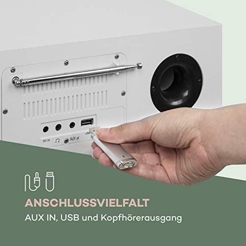 HOOFDTELEFOONVERBINDING: Natuurlijk is er een aansluiting voor het aansluiten van een hoofdtelefoon, zodat u op elk moment naar uw favoriete muziek kunt luisteren zonder anderen te storen. De radio biedt geweldig geluid en overtuigt door zijn ongecompliceerde bediening.