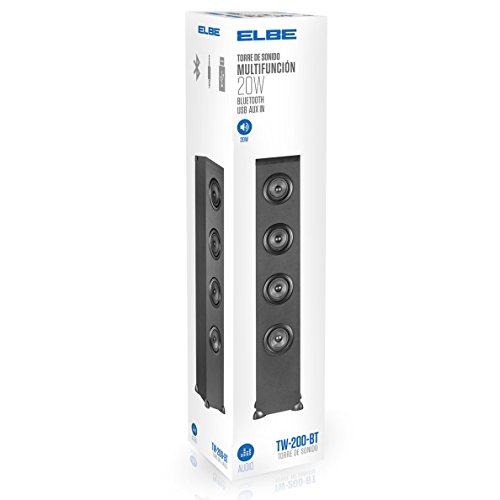 De Elbe TW-402-BT Sound-Toren met Bluetooth biedt een uitstekende geluidskwaliteit en voldoet aan de behoeften van alle gebruikers in huis. Het maakt indruk met 40 W verdeeld over de 4 geïntegreerde luidsprekers van 10 W. De Elbe TW-402-BT soundtoren beschikt over 5 afspeelfuncties (Bluetooth, SD-kaart, USB, line-in en FM-radio autoscan). Incl. handige afstandsbediening voor het bedienen van de bestandsweergave en de overige functies zoals het volume, de tracks of voor het schakelen tussen de afspeelfuncties. Naast de reeds genoemde functies biedt de Elbe TW-402-BT soundtoren de mogelijkheid om de smartphone via de USB-uitgang op te laden, terwijl je de bluetooth-verbinding gebruikt, en beschikt over een automatisch uitschakelsysteem.