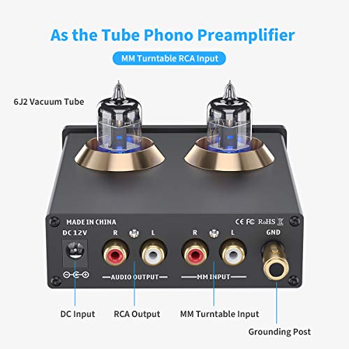 Buizen MM Phono Voorversterker: Zet phono signalen om naar Line Level Signalen met low-noise geïntegreerde circuits en hoogwaardige componenten om lage frequentie ruis te verwijderen zorgen voor een heldere geluidskwaliteit. Ontworpen met aardingspaal om uw platenspeler te beschermen.